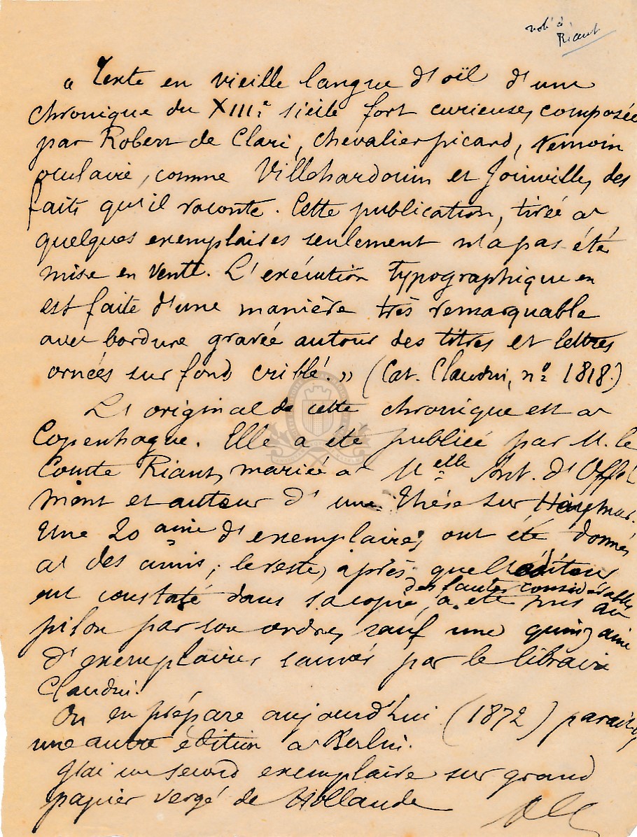 [1 - Thésaurus UNESCO ] Culture:Littérature:Histoire littéraire:Littérature du Moyen AgeTags : Croisades - récit et témoignage Permalink : ./index.php?lvl=notice_display&id=7842 Li estoires de chiaus qui conquisent Coustantinoble, de Robert de Clari en Aminois, chevalier [texte imprimé] / Robert de Clari (1170?-1216?), Auteur ; Paul Riant (1836-1888), Éditeur scientifique . - [S.l.] : [s.n.], [s.d.] . - 87 p. ; 30 cm.
