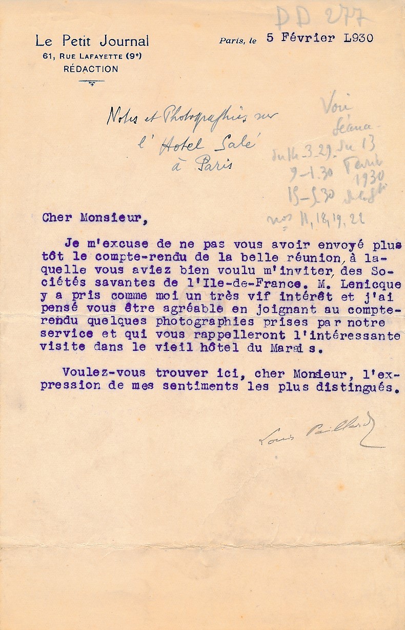 1 Lettre dactylographiée sur un papier à entête du Petit Journal URL | Photographies (7) de l'hôtel Salé URL |