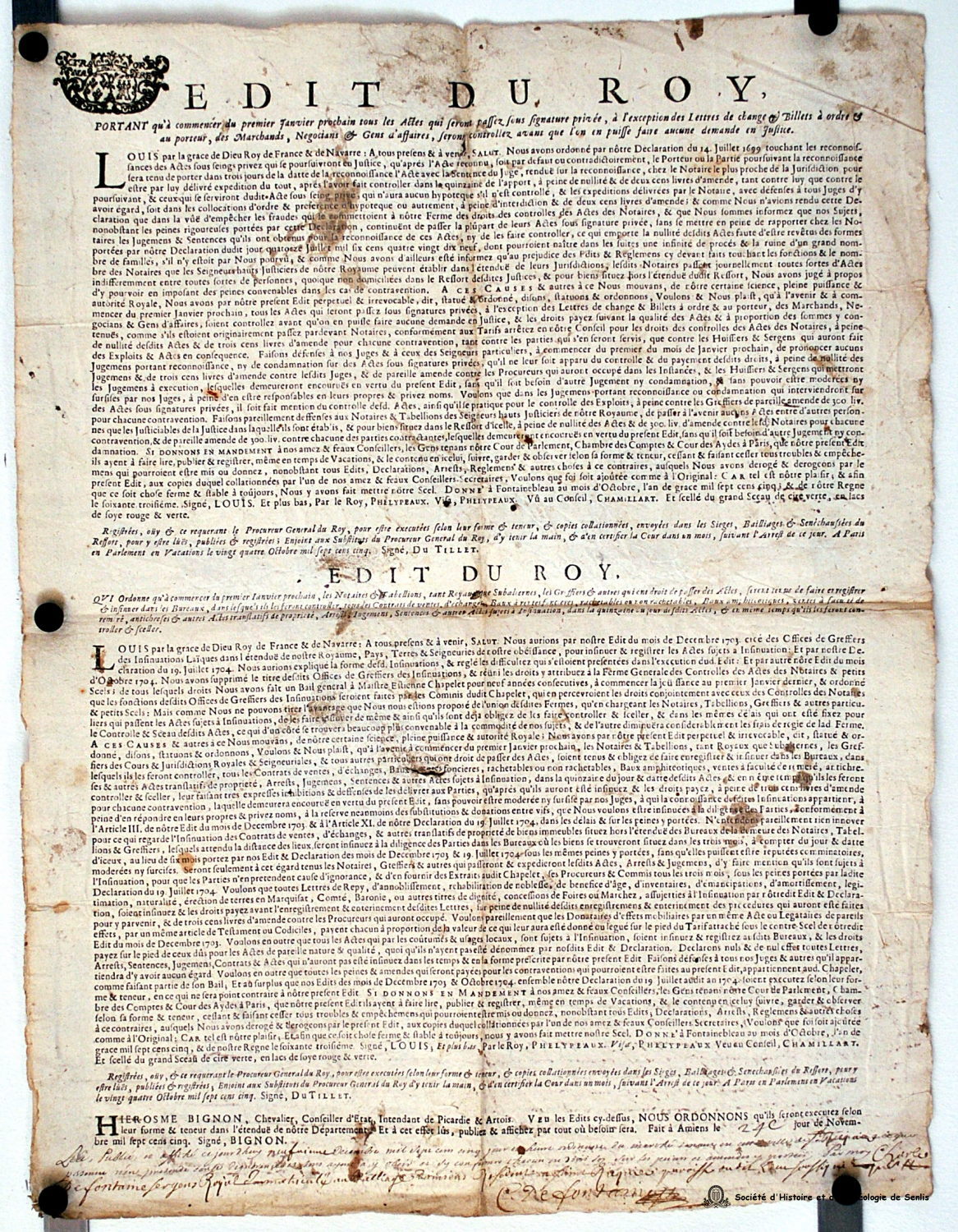 [2 - Thésaurus Brunet-Parguez ] Sciences et Arts:Sciences philosophiques, Education, Politique, Economie:Economie, économie sociale et domestique:Finances:Impôts et finances en FrancePermalink : ./index.php?lvl=notice_display&id=7436 Edit du Roy, Portant qu'à commencer du premier janvier prochain tous les actes qui seront passez sous signature privée, à l'exception des lettres & billets à ordre & au porteur, des marchands, négocians & gens d'affaires, seront controllez avant que l'on en puisse faire aucune demande en justice. [suivi de] Edit du Roy, Qui ordonne qu'à commencer du premier janvier prochain, les notaires & tabellions, tant royaux que subalternes, les greffiers & autres qui ont droit de passer des actes, seront tenus de faire enregistrer [...] tous les contrats de vente [...] [texte imprimé] / Louis XIV, roi de France (1638-1715), Auteur ; Jean-Frédéric Phélypeaux ; comte de Maurepas (1701-1781)