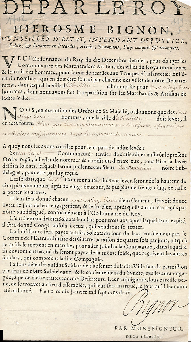 PermalinkDe par le Roy Hierosme Bignon, conseiller d'Estat, intendant de justice, police, & finances en Picardie, Artois, Boulonnois, Pays conquis & reconquis. Veu l'ordonnance du Roy du dix décembre dernier [...] Ordonnons que des cent vingt deux [122] hommes, que la ville d'Abbeville doit lever, il en sera fourni huit par les communautés des drapiers, faussetiers et fripiers conjointement dans le courant de ce mois [...] / Jérôme Bignon ([s.d. (1702)])