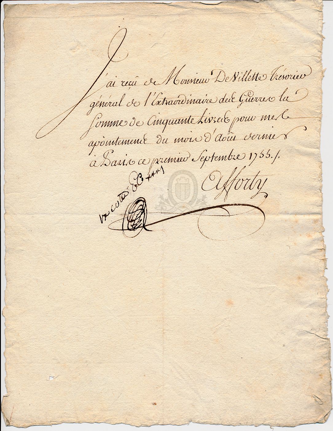 PermalinkPermalinkPermalinkReçu manuscrit d'appointements avec autographe du chanoine Afforty / Charles François Afforty (1755 (09-01))