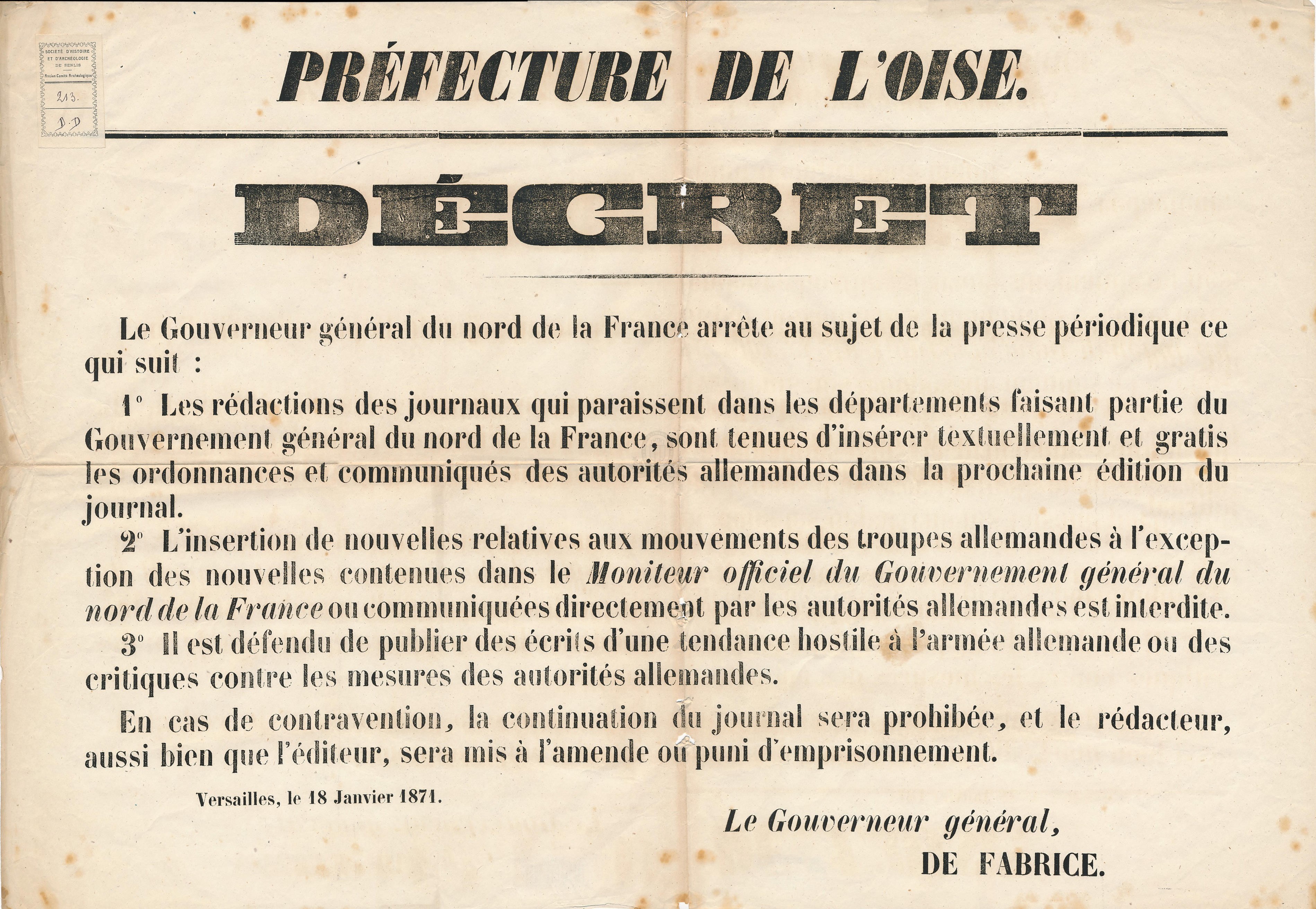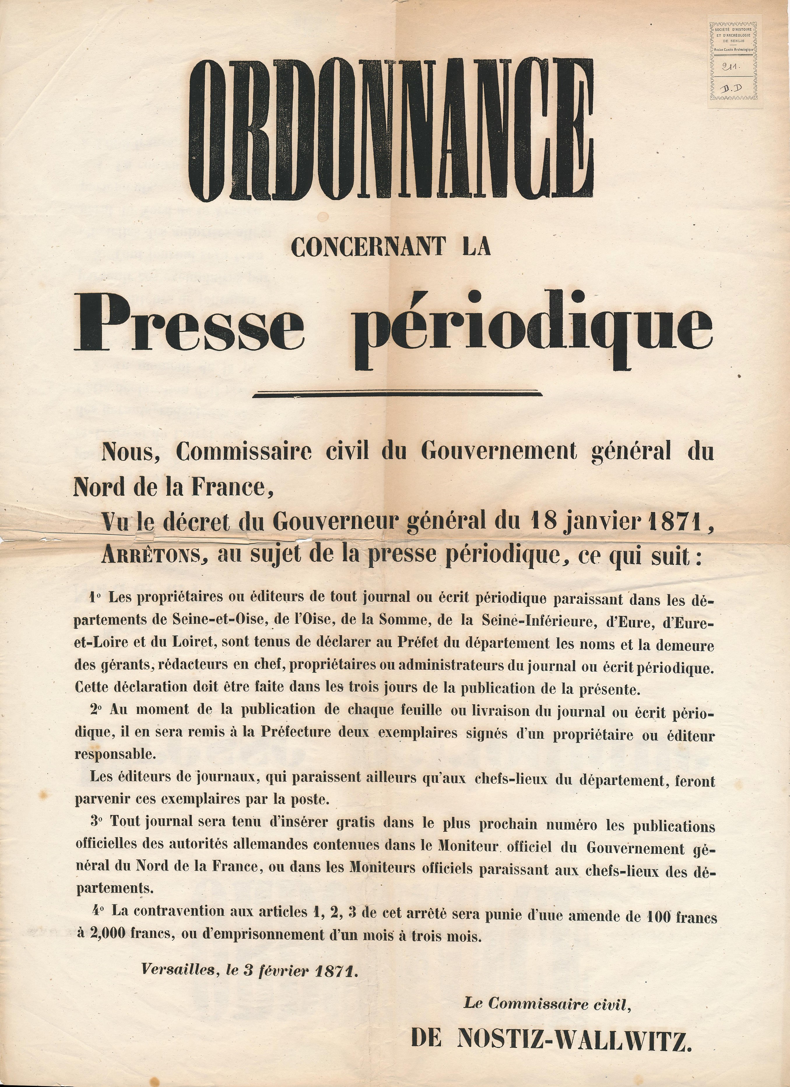 Décret de la Préfecture de l'Oise au sujet de la presse périodiqueURL