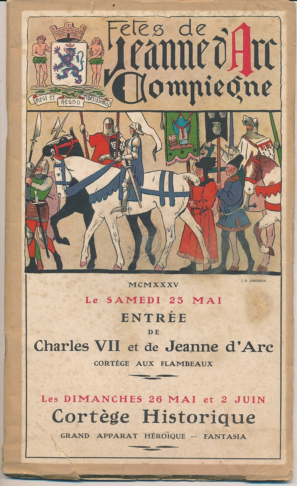 Les dimanches 26 mai et 2 juin, cortège historique - grand apparat héroïque - FantasiaPermalink : ./index.php?lvl=notice_display&id=18561 Fêtes en l'honneur de Jeanne d'Arc les 25, 26 mai et 2 juin 1935 : [programme] [texte imprimé] / Ville de Compiègne, Organisateur de réunion ; Le Souvenir National de Jeanne d'Arc, Collaborateur ; Les Bons Compagnons du Tournoi de Compiègne, Collaborateur ; Syndicat d'initiative (Compiègne), Collaborateur ; Joseph Porphyre Pinchon (1871-1953), Illustrateur . - Compiègne : imprimerie de Compiègne, 1935 . - 32 p. : plan dépl., ill. ; 28 cm.