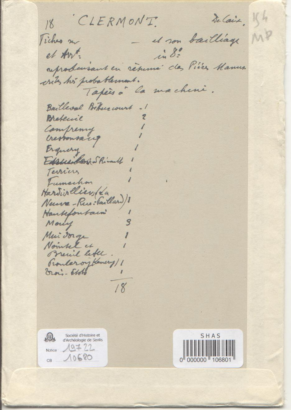 PermalinkFiches tapuscrites reproduisant en résumé des pièces manuscrites concernant l'arrondissement de Clermont de l'Oise / Amédée de Caix de Saint-Aymour ([s.d. (ca 1950)])