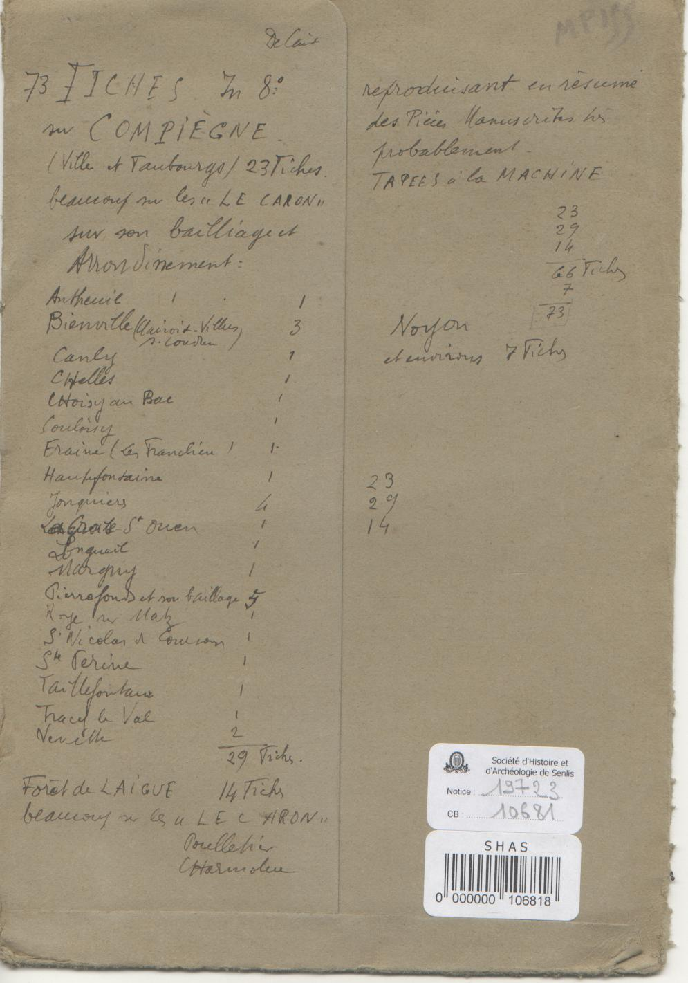 PermalinkFiches tapuscrites reproduisant en résumé des pièces manuscrites concernant l'arrondissement de Compiègne / Amédée de Caix de Saint-Aymour ([s.d. (ca 1950)])