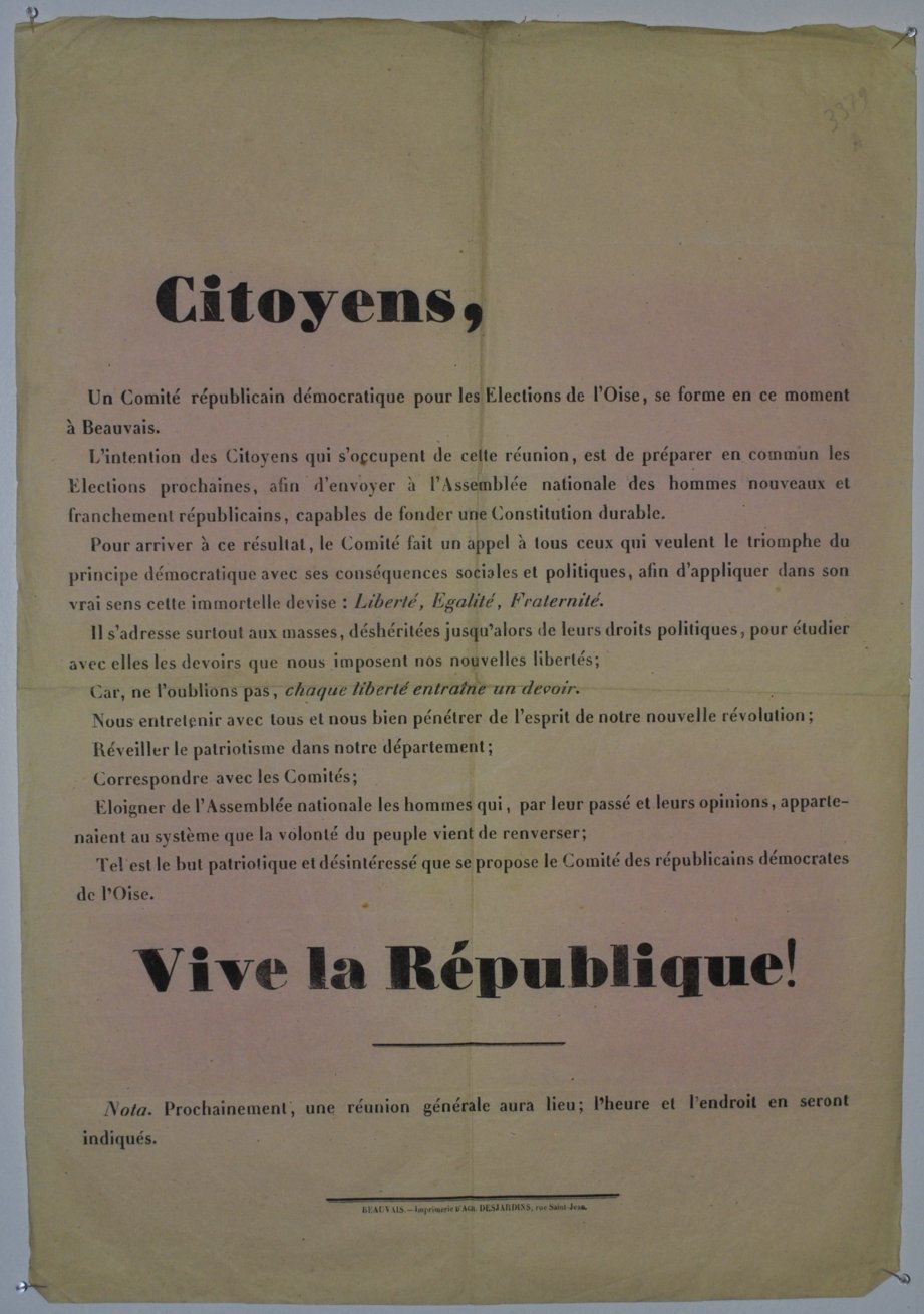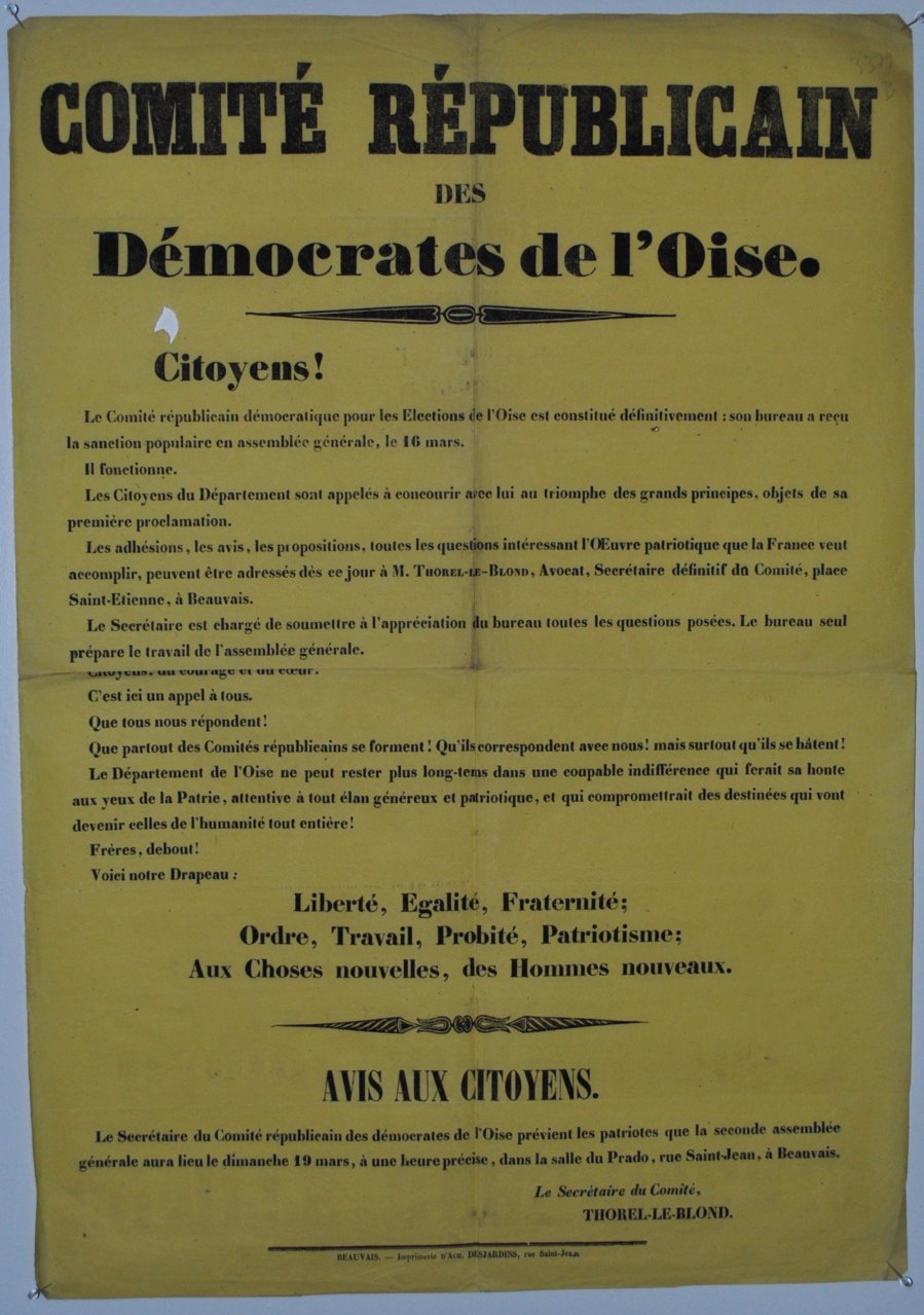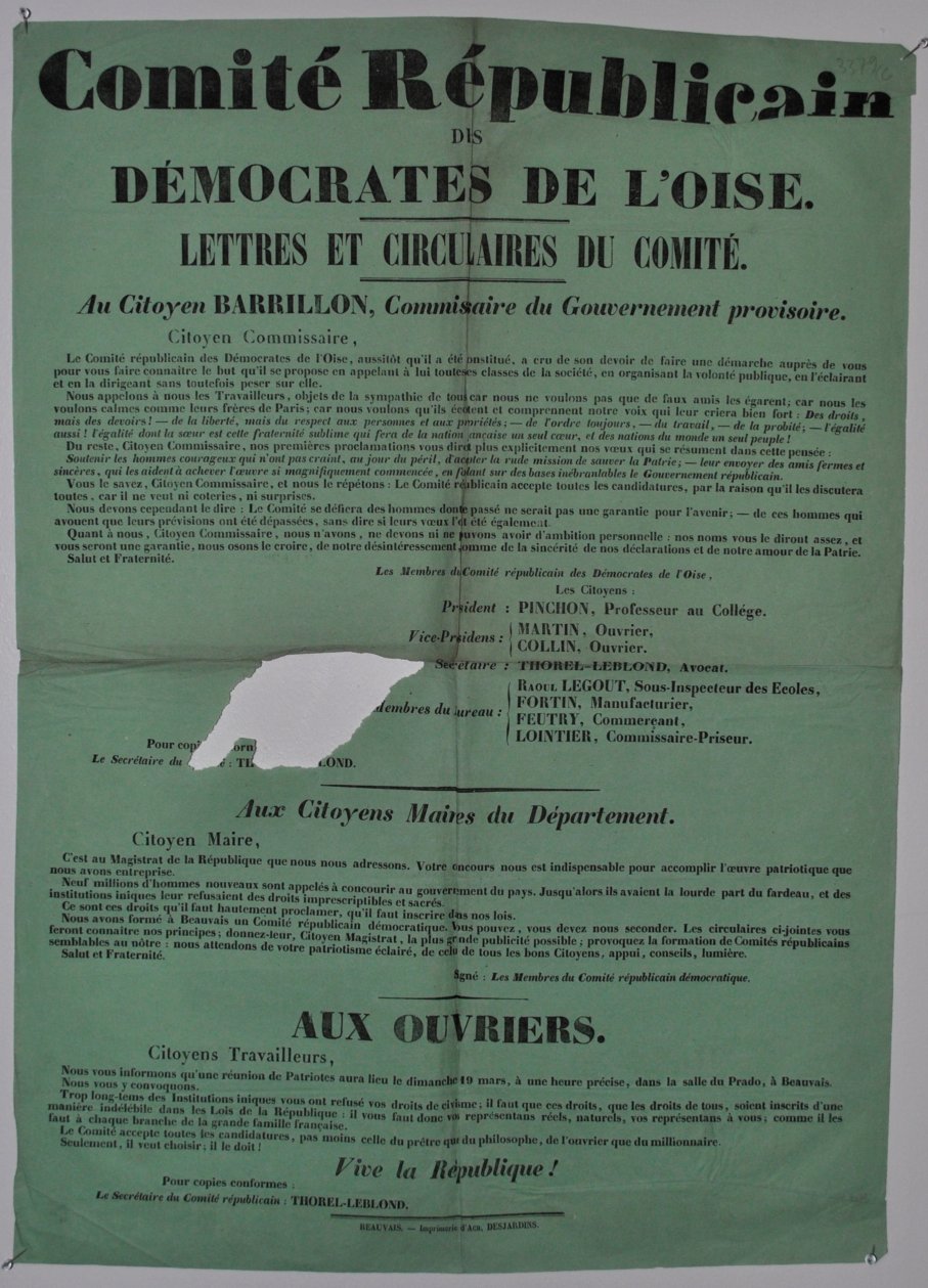 PermalinkComité Républicain des Démocrates de l'Oise. Citoyens! le comité républicain démocratique pour les élections de l'Oise est constitué définitivement [...] ([s.d. (1848 ?)])
