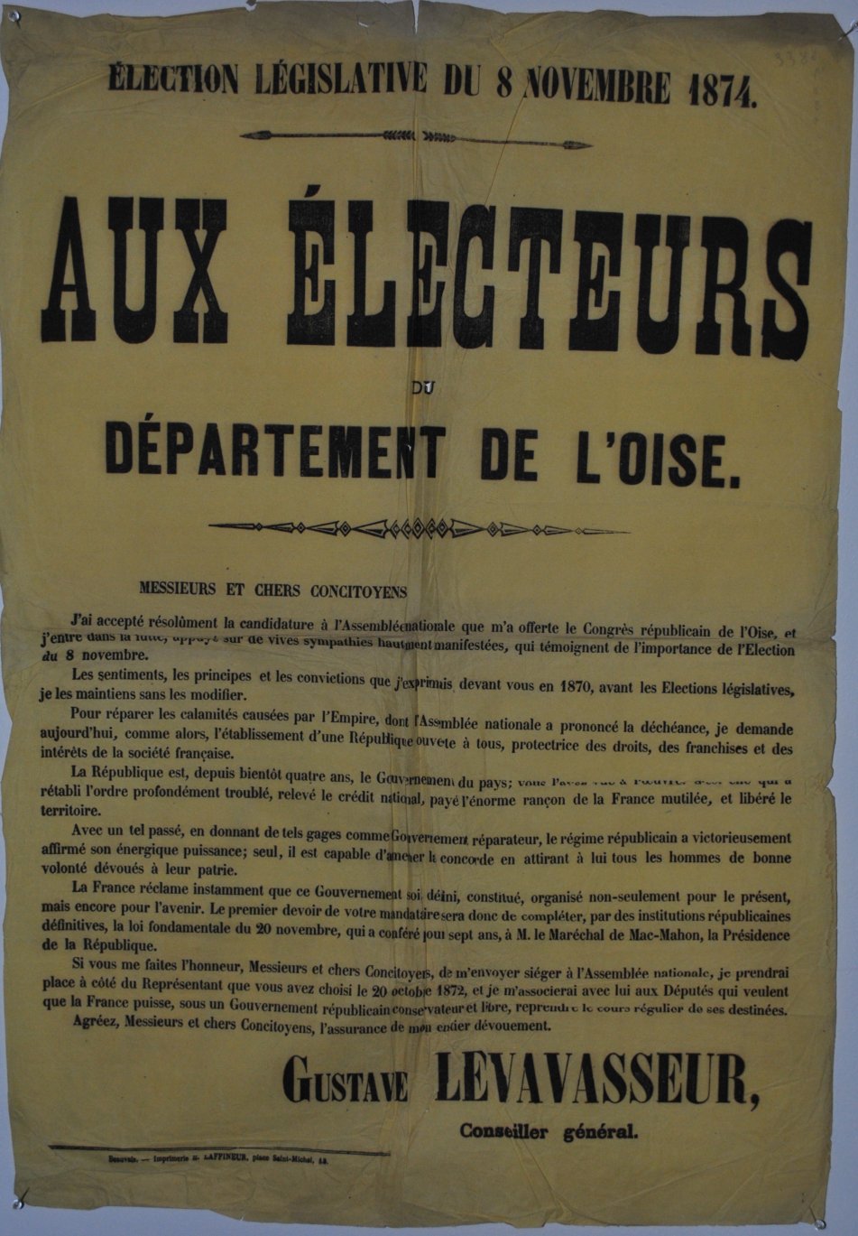 PermalinkÉlection législative du 8 novembre 1874. Aux électeurs du département de l'Oise [...] / Louis Fernand Gustave Levavasseur (1874)