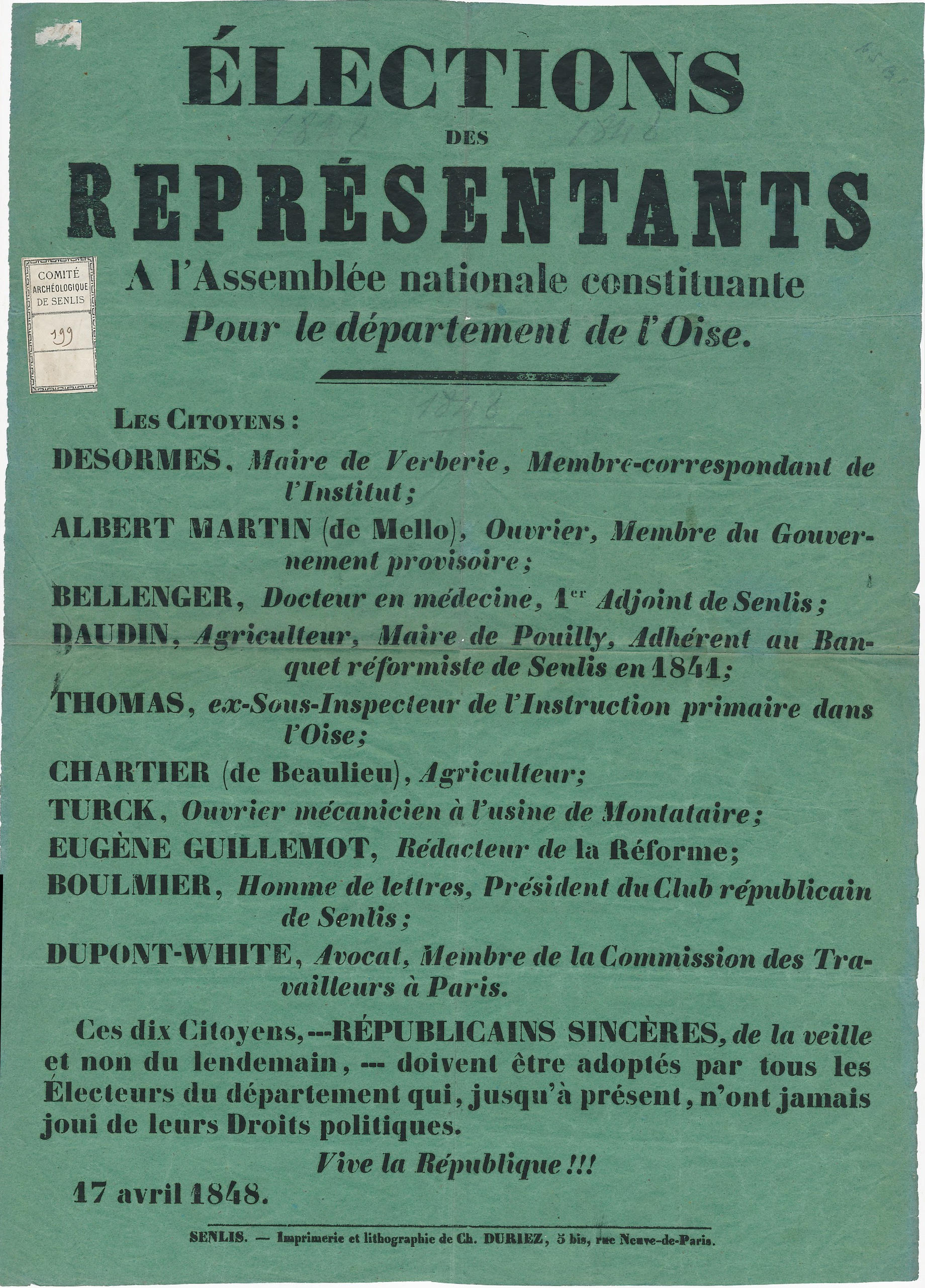 PermalinkÉlections des représentants à l'Assemblée nationale constituante pour le département de l'Oise [liste des citoyens républicains candidats] (1848)